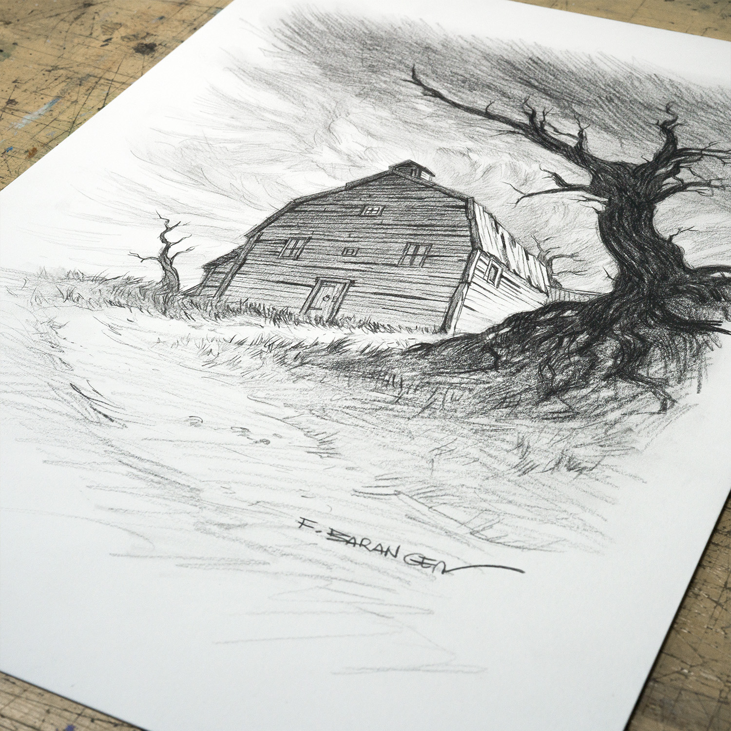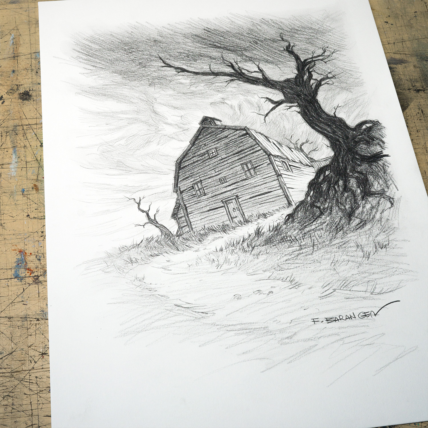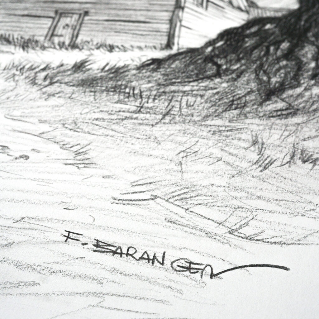 Ce dessin fait partie de la série réalisée par François Baranger pour définir les modèles de dédicaces proposés sur la boutique. C’est un dessin unique, qui a été retravaillé pour atteindre un niveau de détail plus élevé que les dédicaces faites dans les livres.