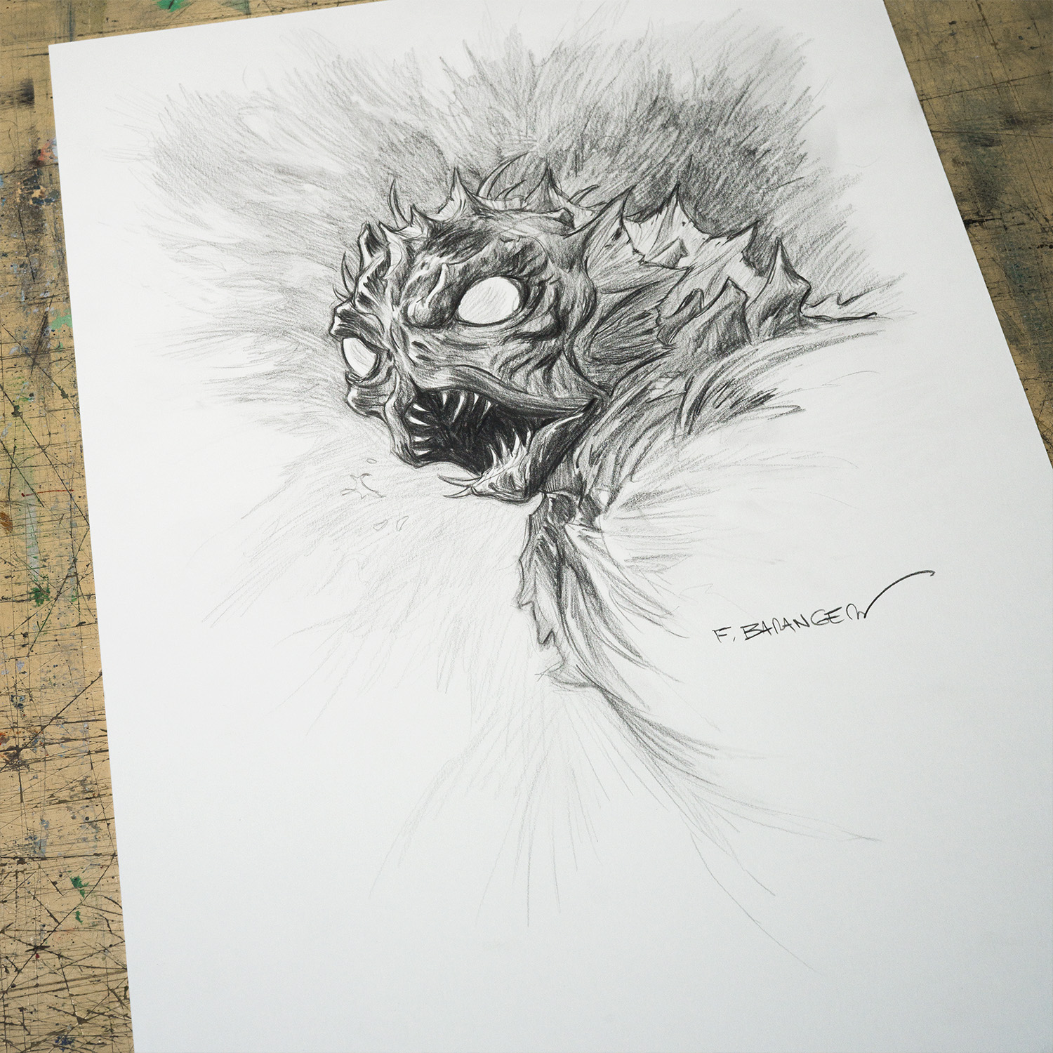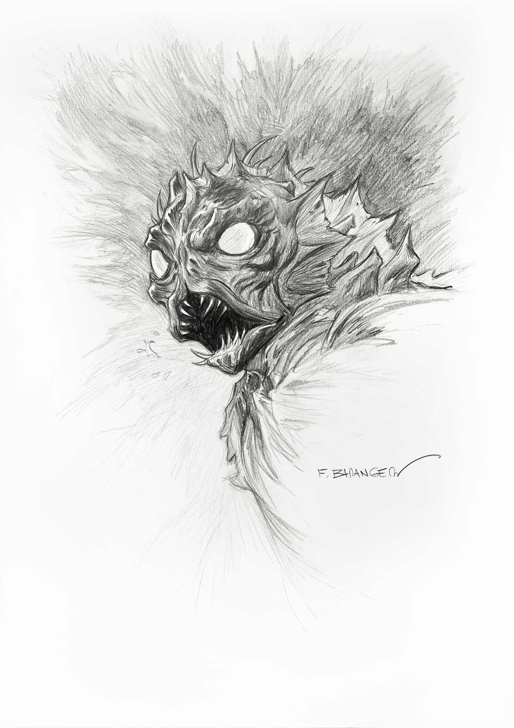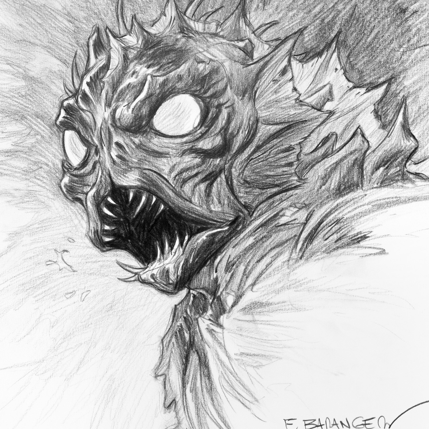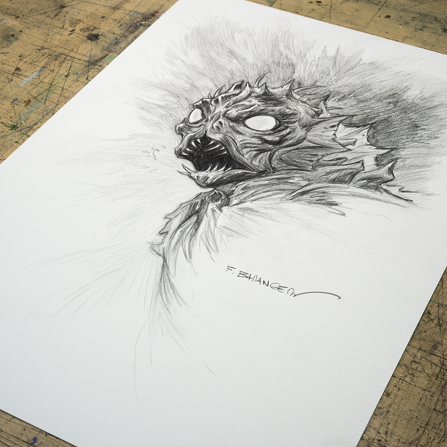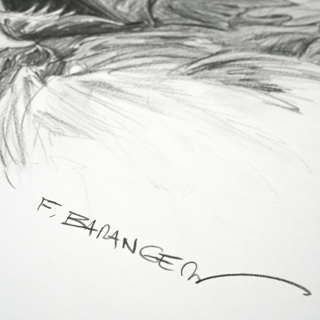 Ce dessin fait partie de la série réalisée par François Baranger pour définir les modèles de dédicaces proposés sur la boutique. C’est un dessin unique, qui a été retravaillé pour atteindre un niveau de détail plus élevé que les dédicaces faites dans les livres.