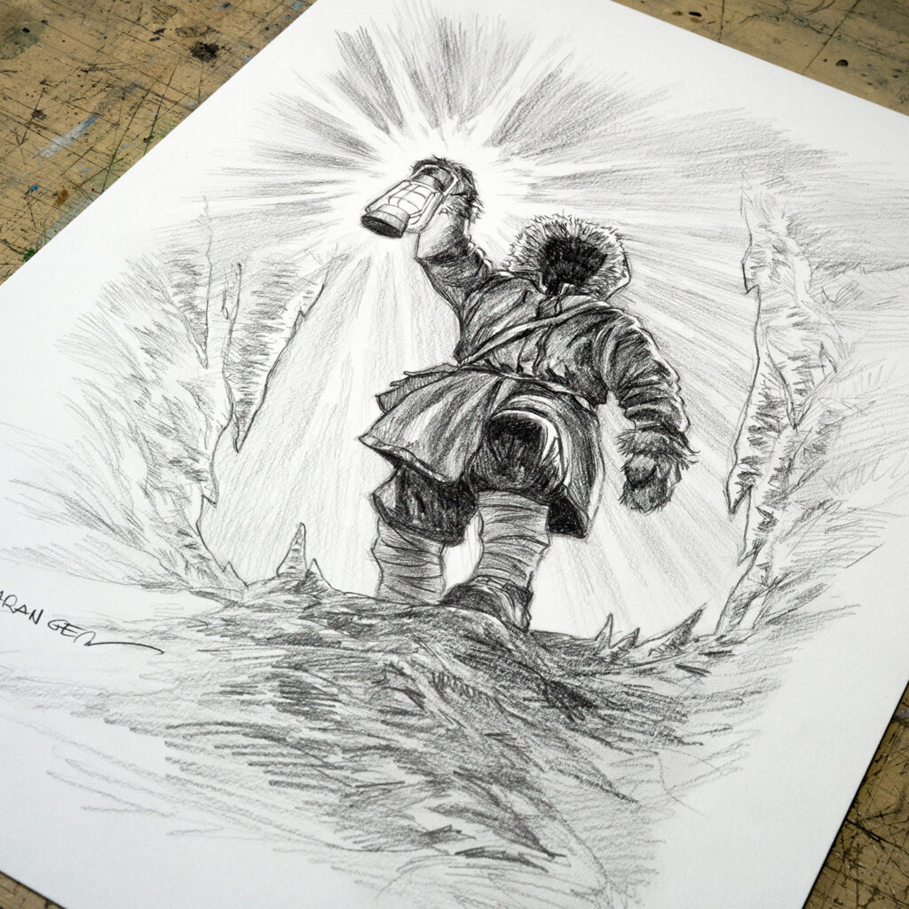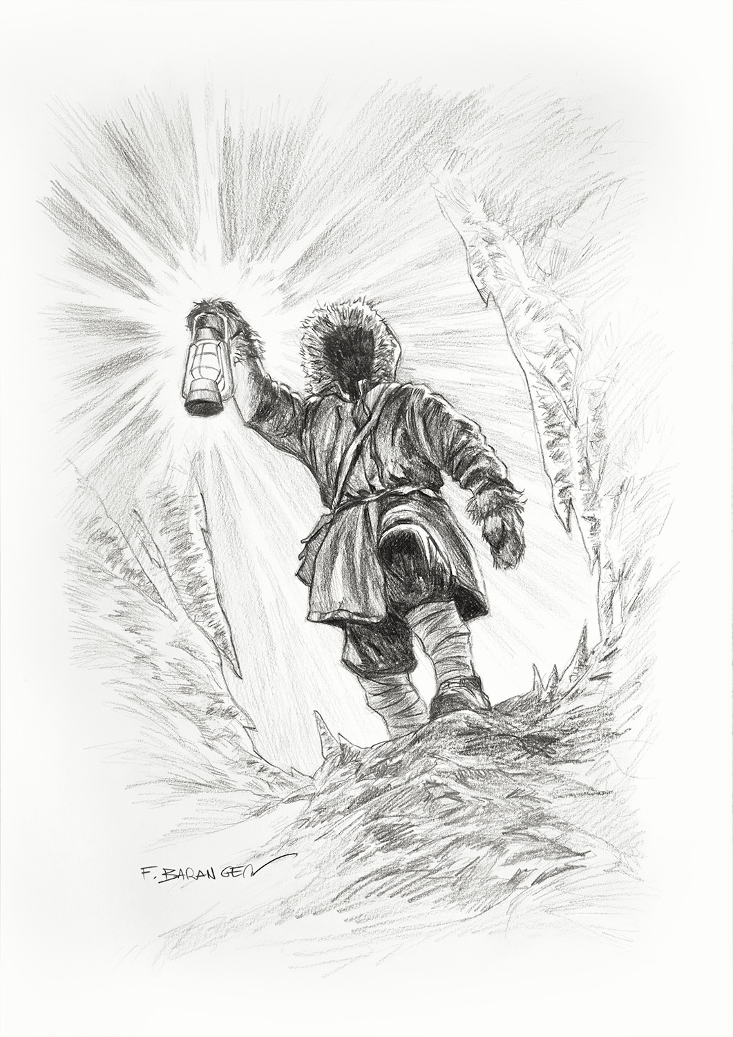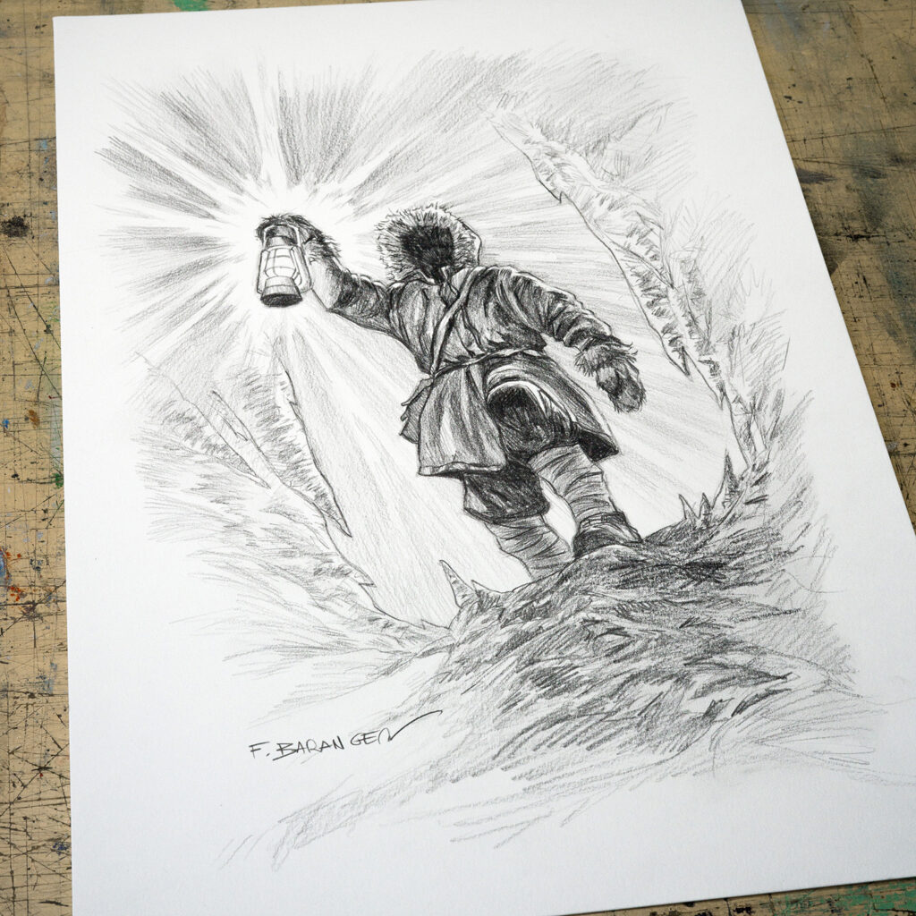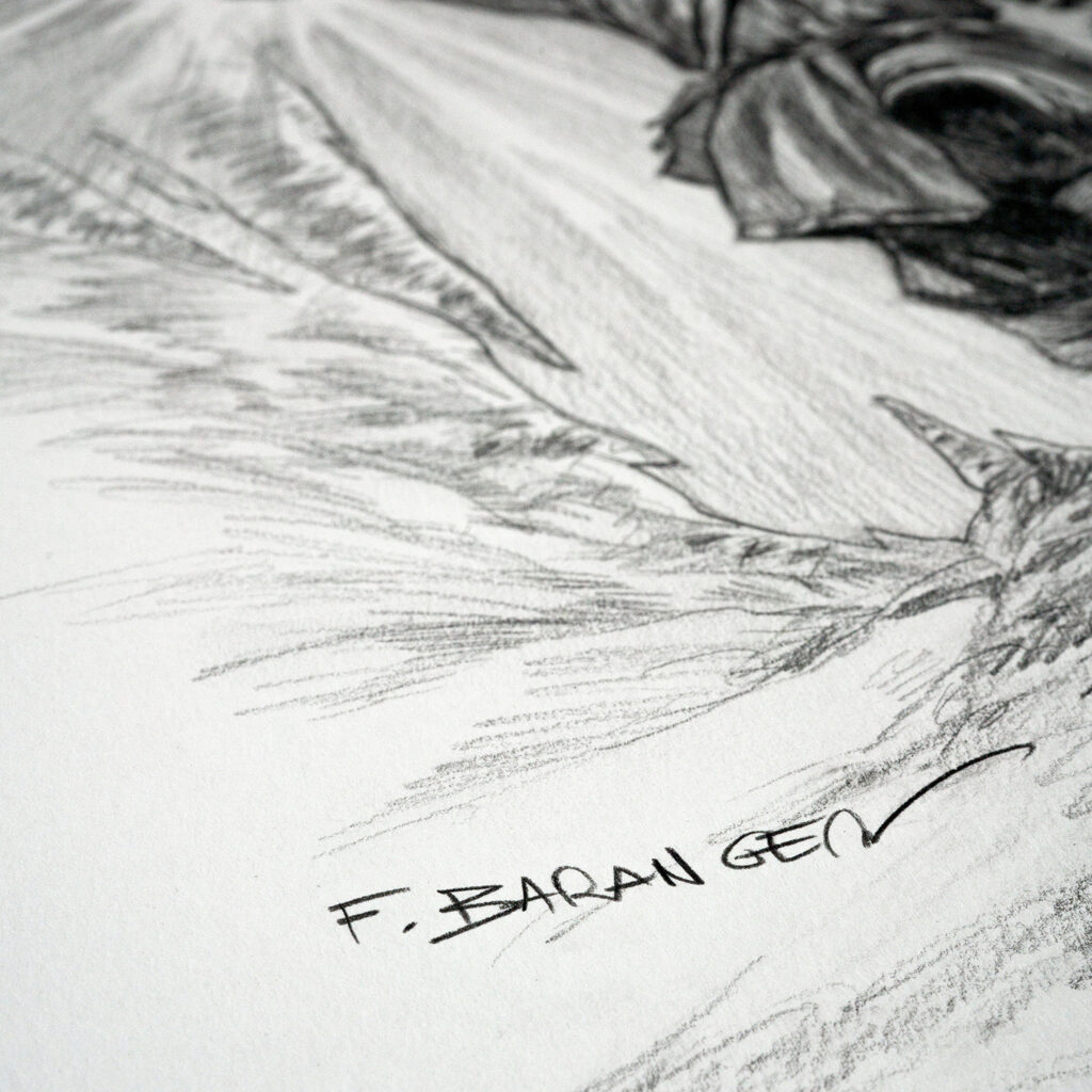 Ce dessin fait partie de la série réalisée par François Baranger pour définir les modèles de dédicaces proposés sur la boutique. C’est un dessin unique, qui a été retravaillé pour atteindre un niveau de détail plus élevé que les dédicaces faites dans les livres.