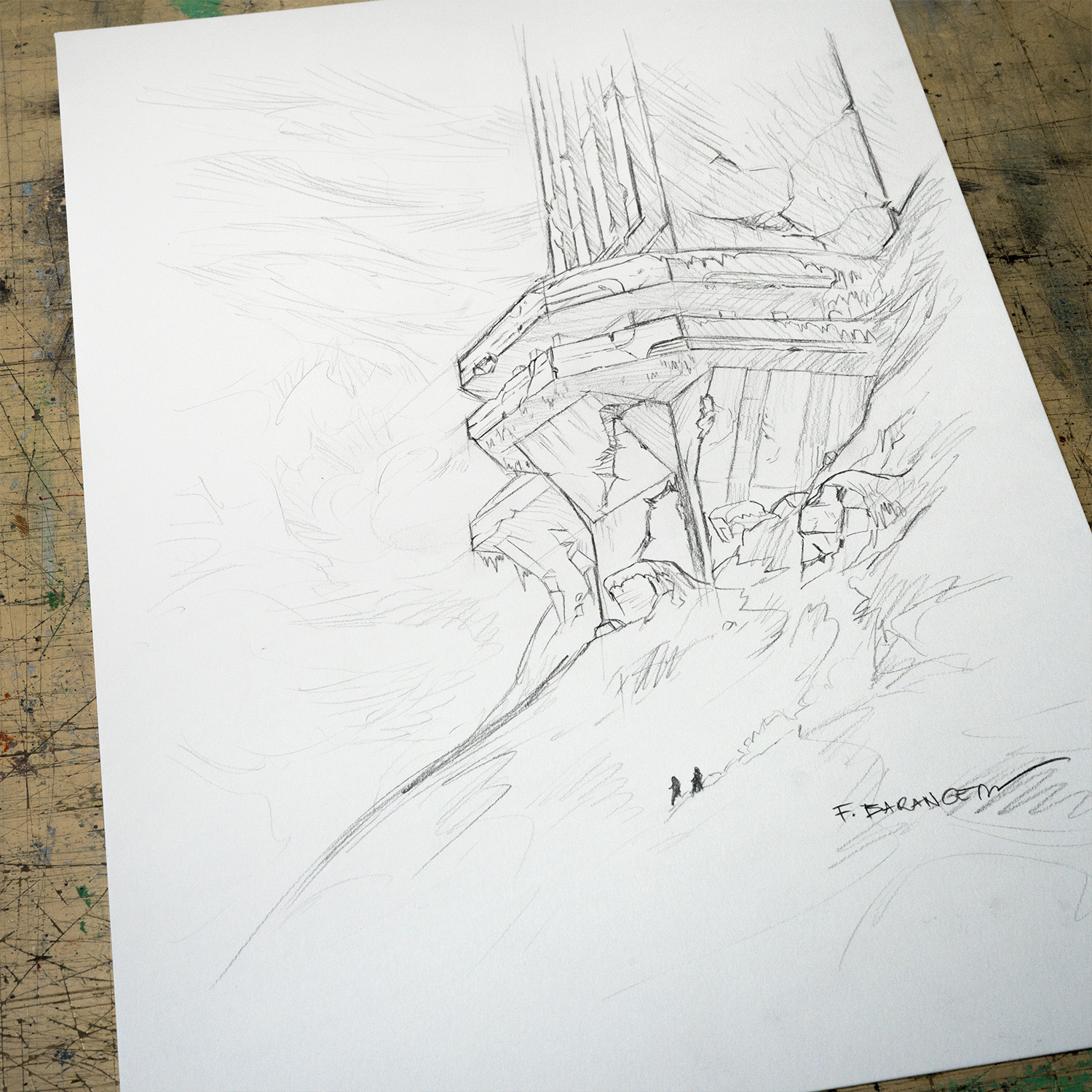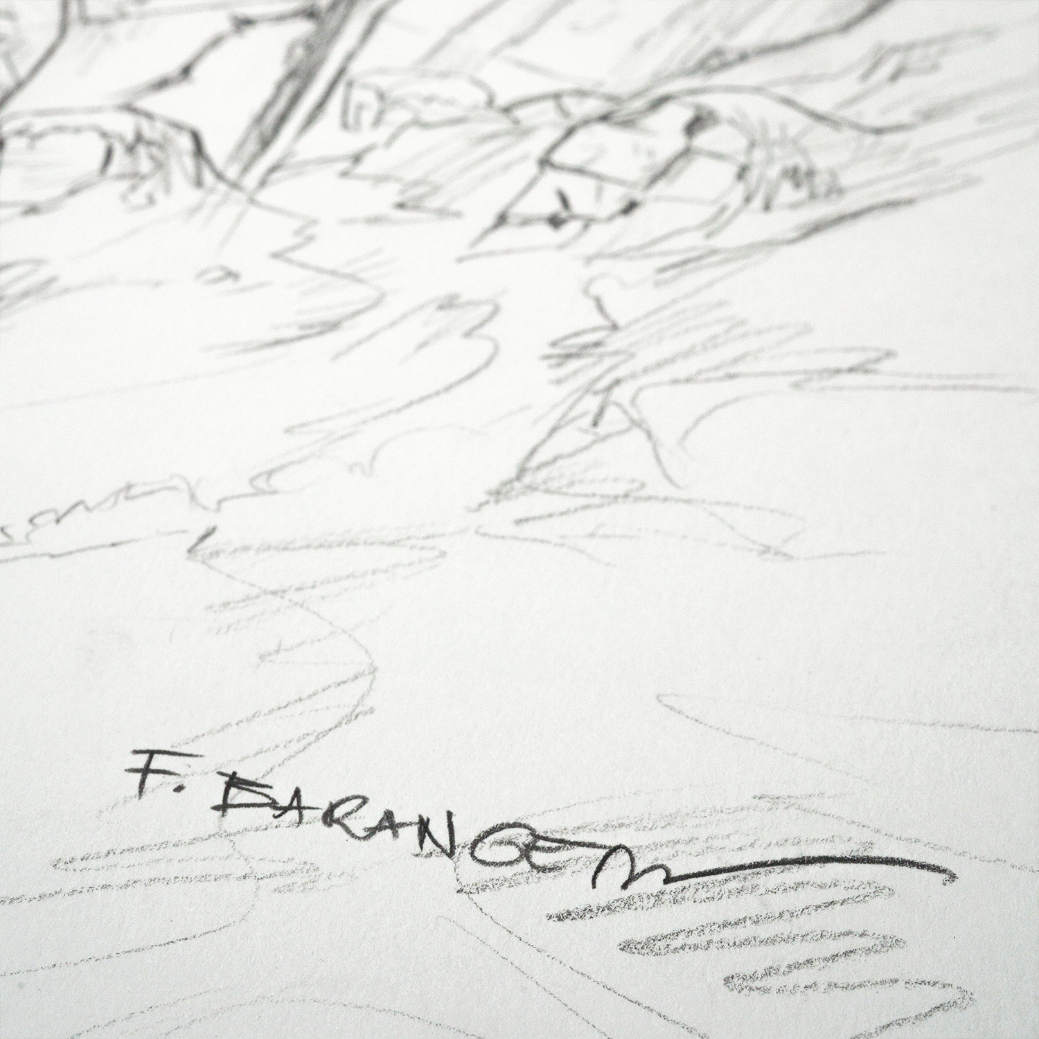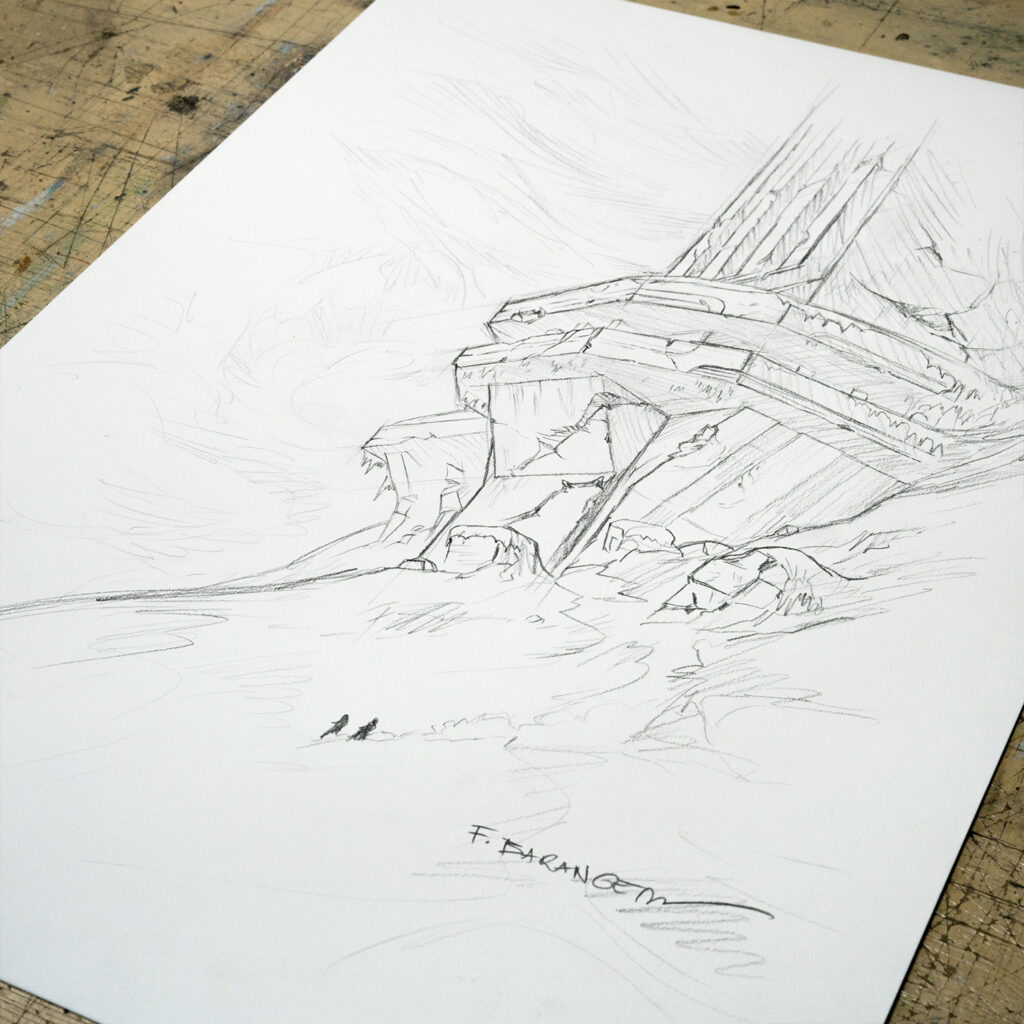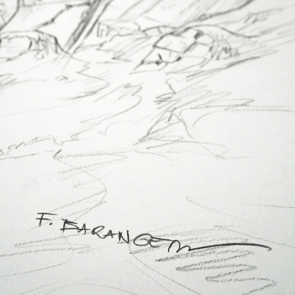 Ce dessin fait partie de la série réalisée par François Baranger pour définir les modèles de dédicaces proposés sur la boutique. C’est un dessin unique, qui a été retravaillé pour atteindre un niveau de détail plus élevé que les dédicaces faites dans les livres.