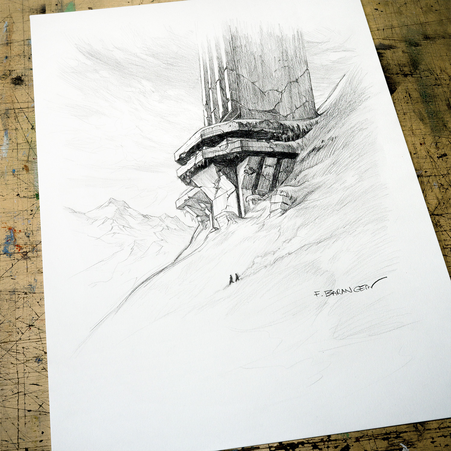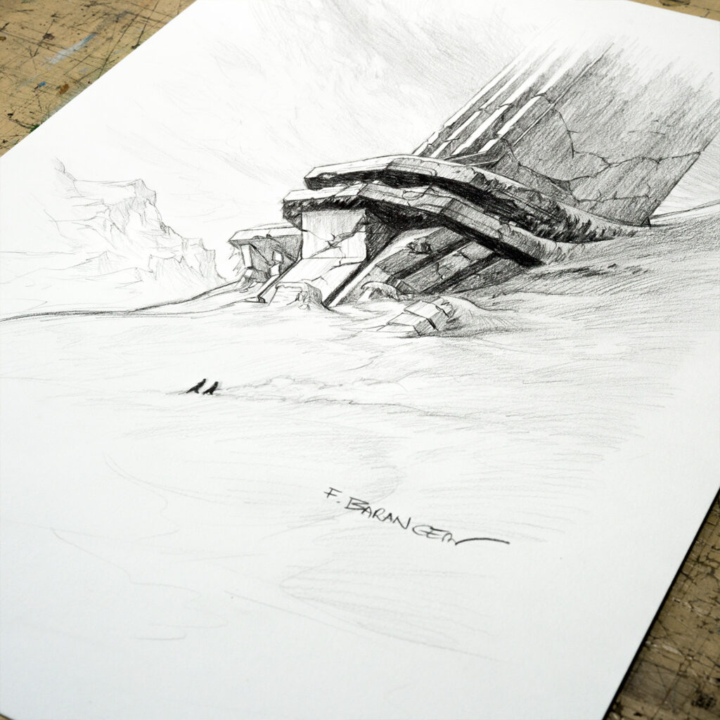 Ce dessin fait partie de la série réalisée par François Baranger pour définir les modèles de dédicaces proposés sur la boutique. C’est un dessin unique, qui a été retravaillé pour atteindre un niveau de détail plus élevé que les dédicaces faites dans les livres.