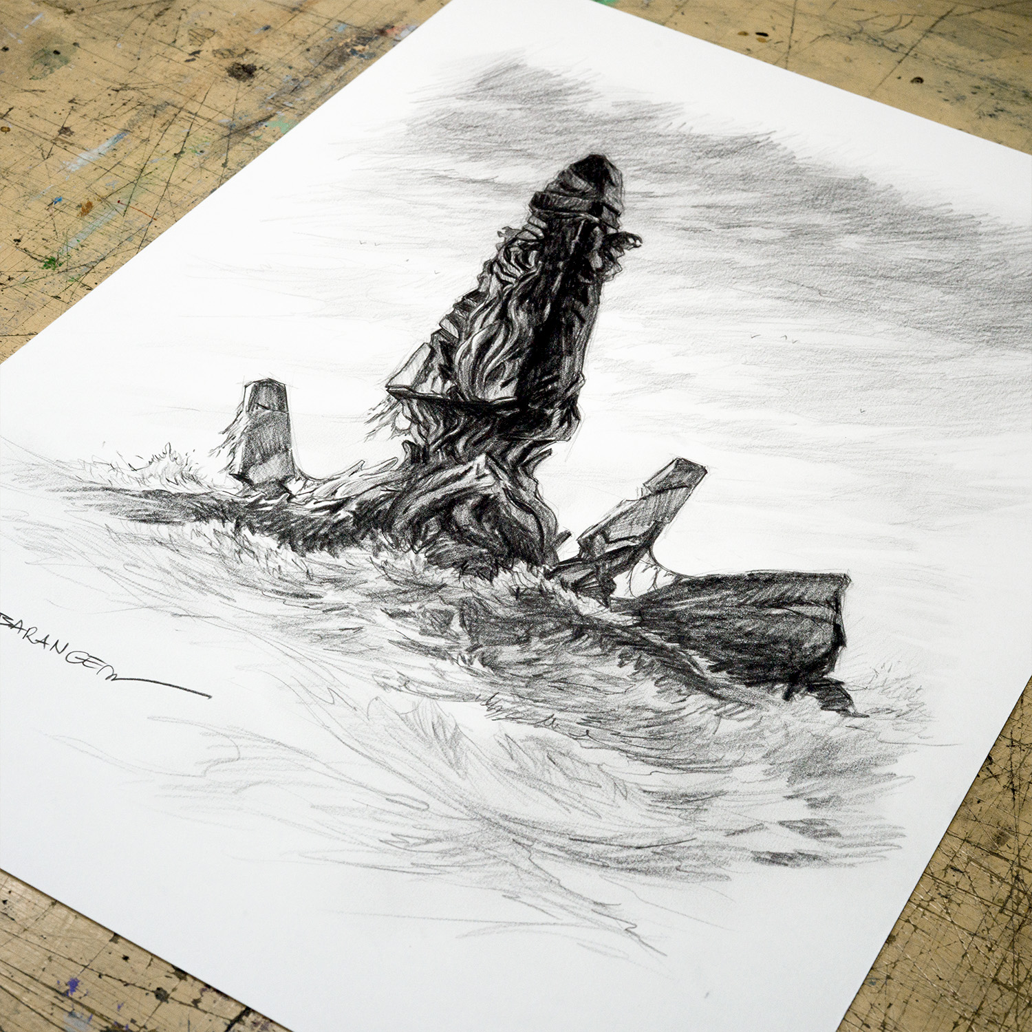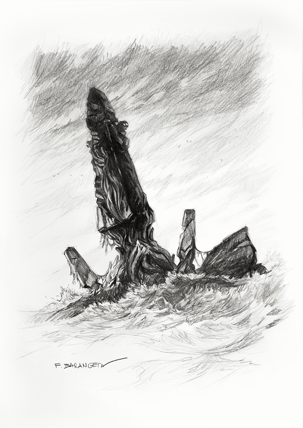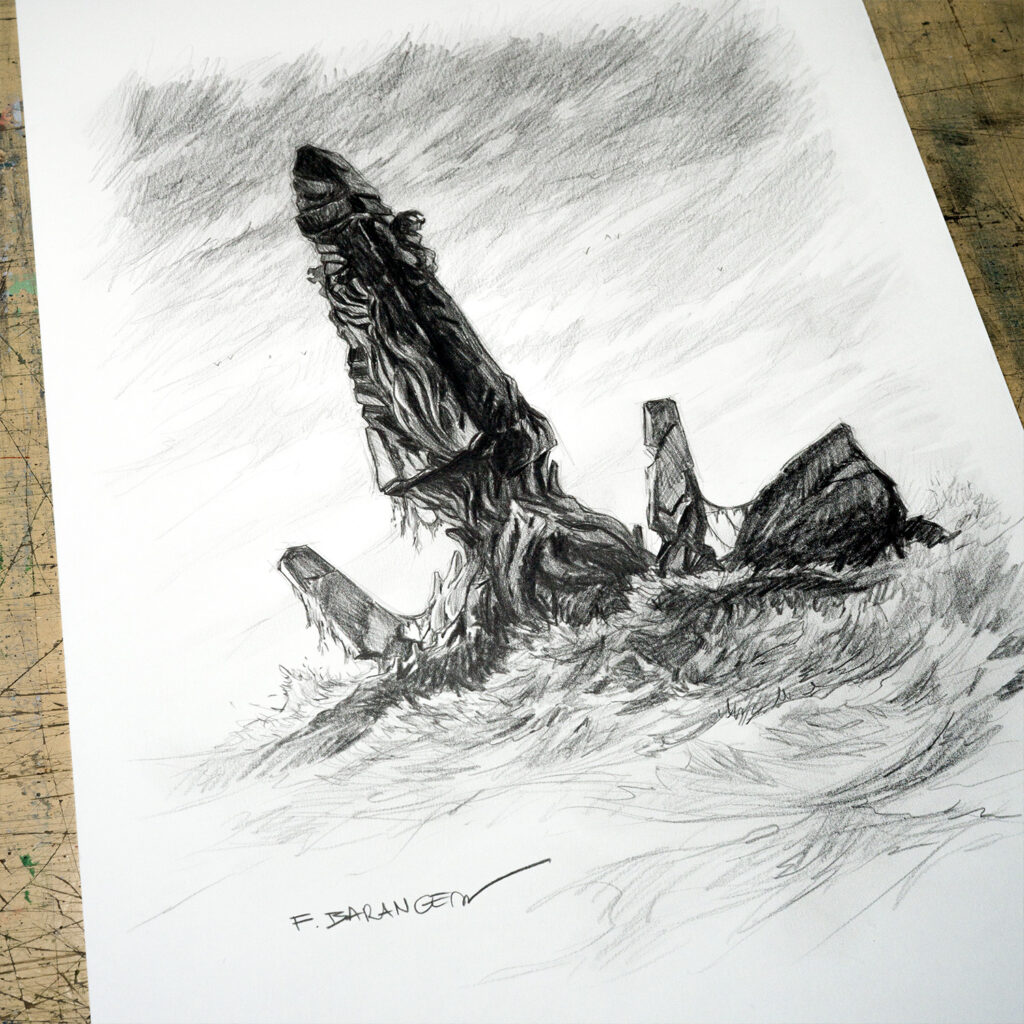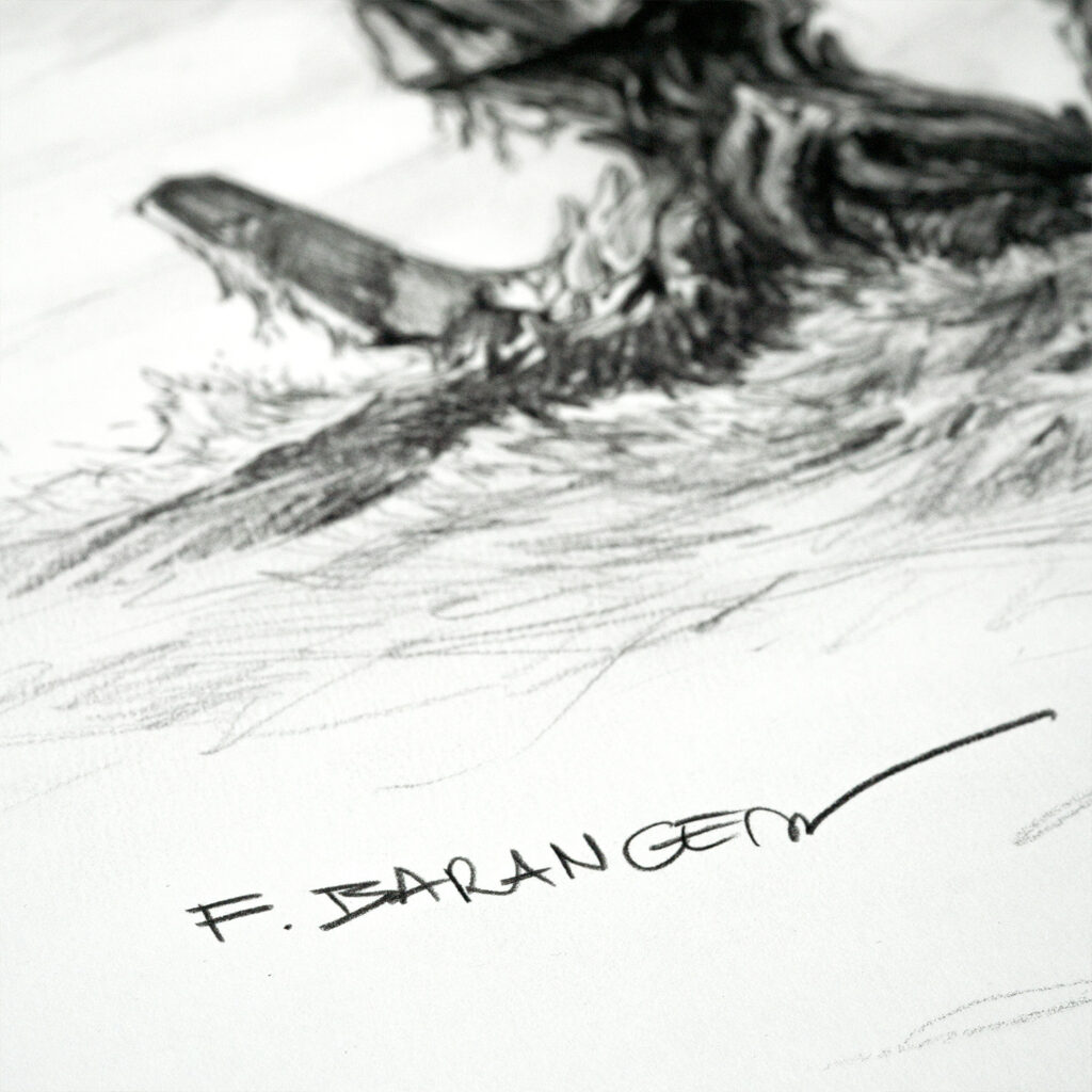 Ce dessin fait partie de la série réalisée par François Baranger pour définir les modèles de dédicaces proposés sur la boutique. C’est un dessin unique, qui a été retravaillé pour atteindre un niveau de détail plus élevé que les dédicaces faites dans les livres.